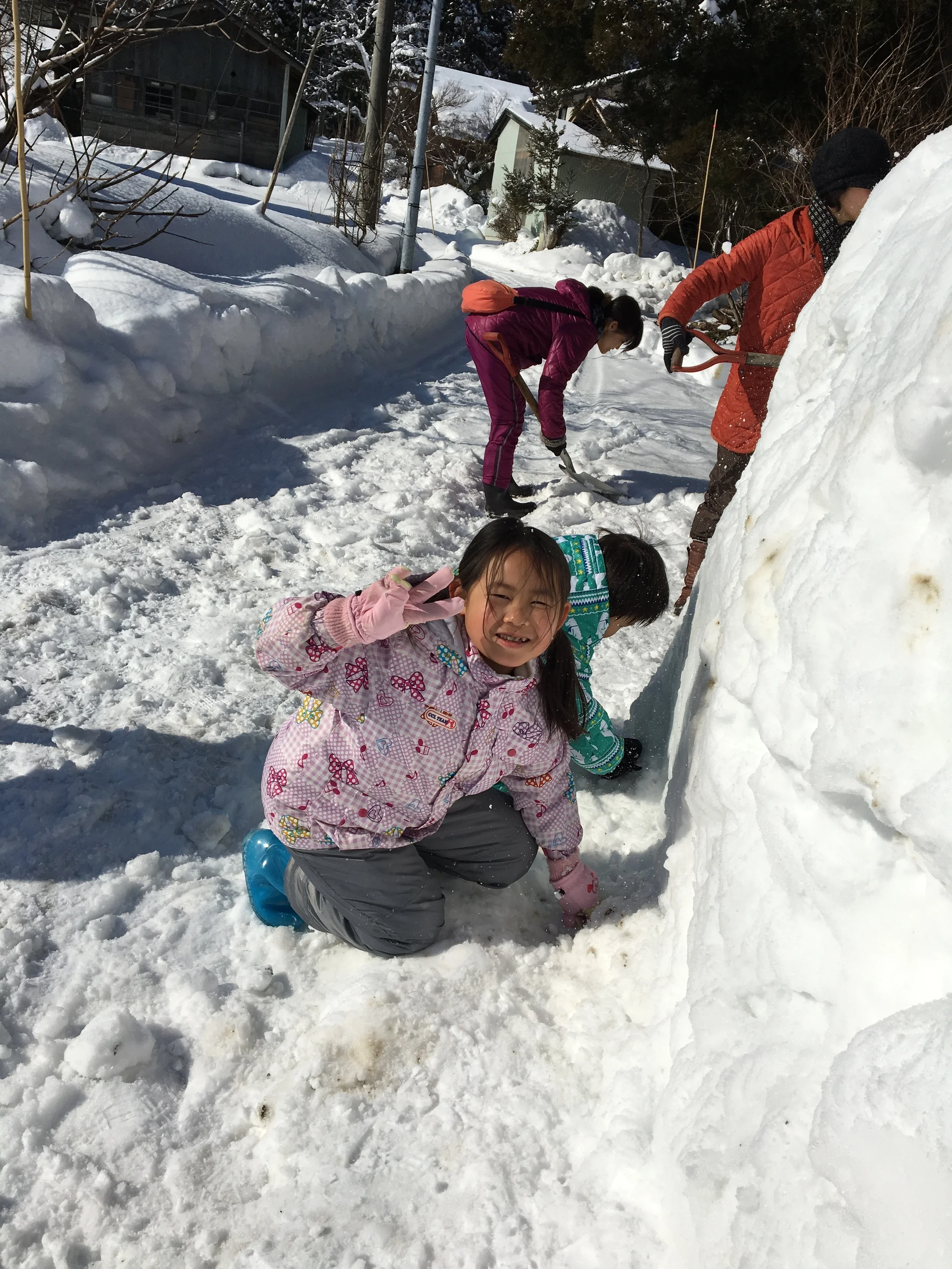 その後、入口からずんずんと掘る!スコップで掘ったら、その雪を運び出す!