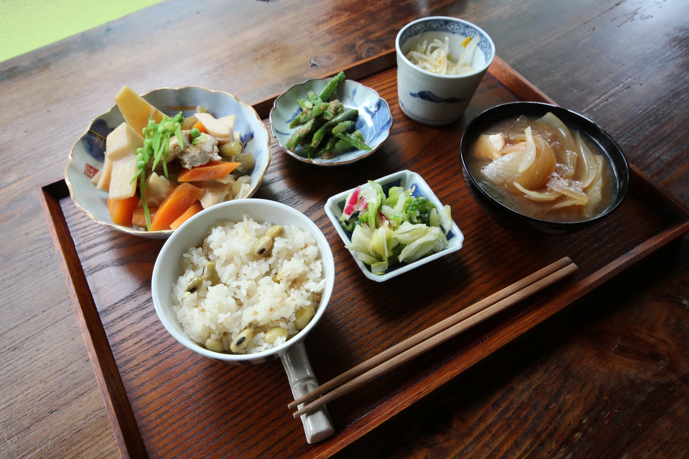 最上町のアスパラのゴマ和え、青ばた豆、鶏ひき肉、生姜のおふかし(おこあ)など
