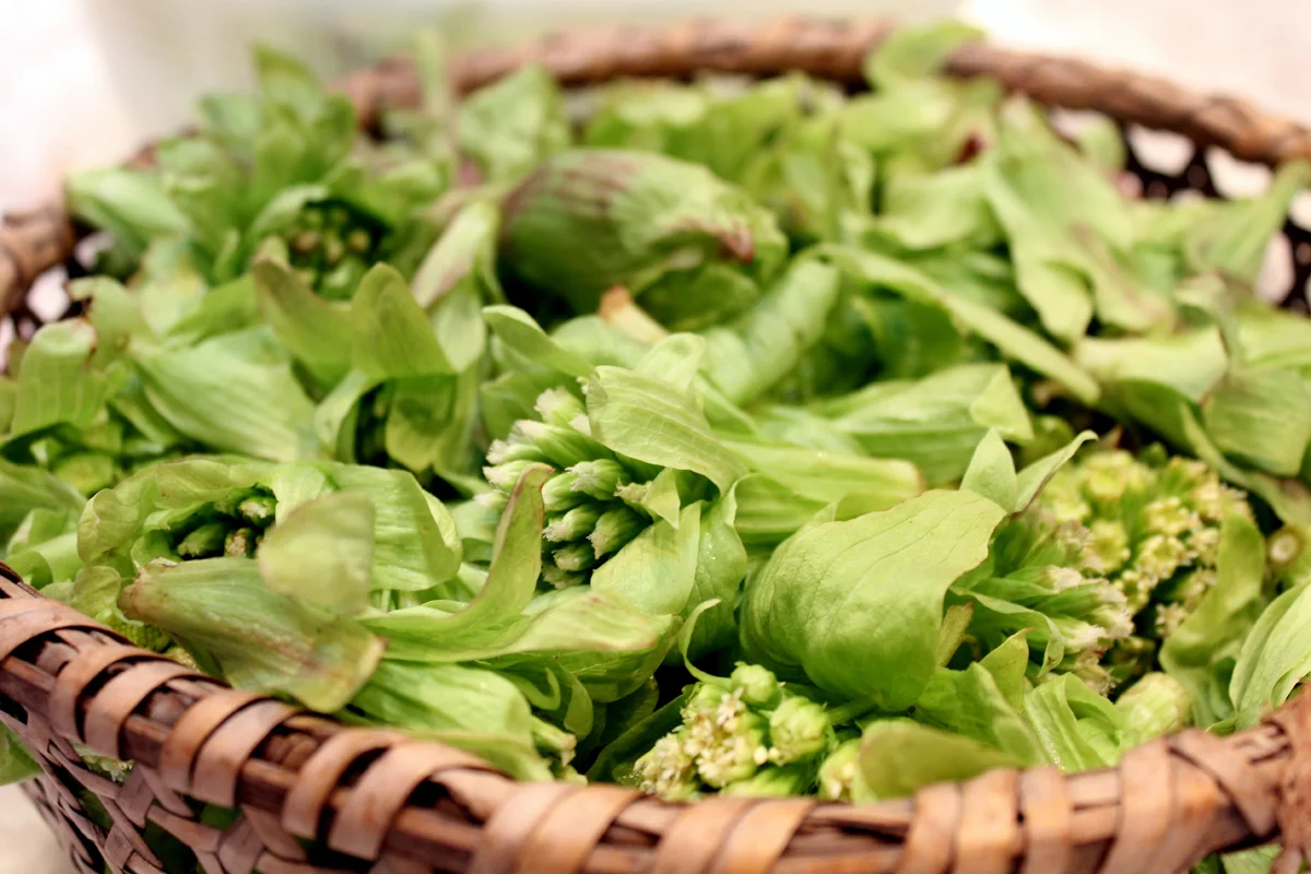 ふきのとうは、ふきの花のつぼみでまだ葉が出る前、先に地上に出てくる部分。『春の皿に苦みを盛れ』という言い伝えがあるそうですが、冬の間に溜まった脂肪を流し、味覚を刺激することで気分を引き締め新しい1年をスタートするという意味。冬眠から覚めた熊が最初に食べるのも苦い春の味だとか。「土風里」高橋さんのばっけ味噌は綺麗な緑色を残しながら作るのがポイント。じゃがいも餅、田楽など春の味をご一緒にどうぞ!